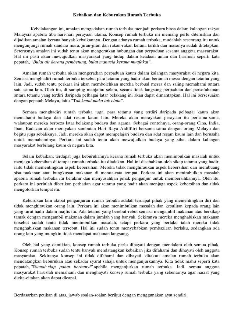 Kebaikan Dan Keburukan Rumah Terbuka. Panjang karangan anda hendaklah antara 200 hingga 250 patah perkataan.